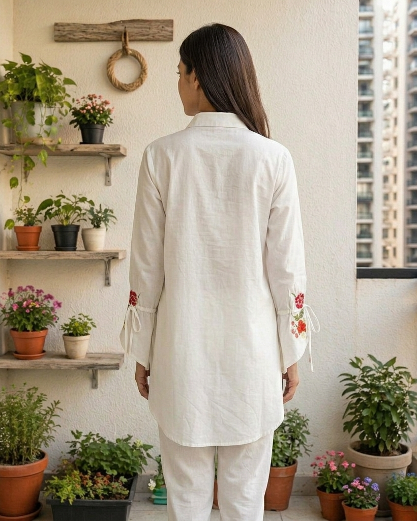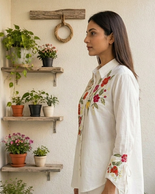 Discover an elegant white embroidered shirt for women, skillfully crafted to bring together timeless style and modern comfort. Its intricate embroidery adds a touch of sophistication, making it perfect for both casual outings and semi-formal events.